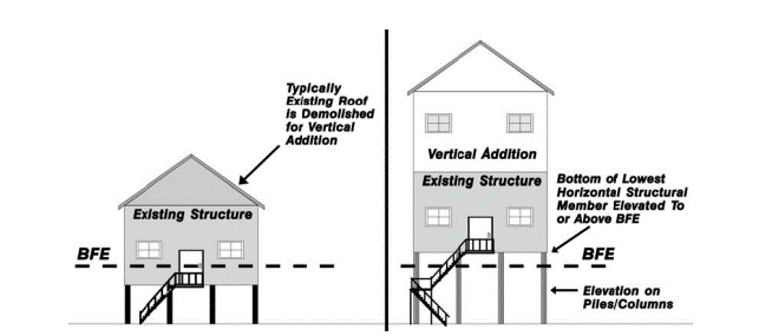 Improvements made to a home that sit below the BFE are considered "non-conforming" if they appear to be used for anything but parking vehicles, storage or building access. However, since these regulations and building codes were adopted in the mid-70s to address FEMA regulations, spaces may be legally non-conforming if it can be proven that the modifications were made before that time. This impacts those wanting to renovate due to the 50% rule, which states that for properties within a special flood hazard zone, the cost of substantial improvements or the cost to repair damage to a structure cannot exceed 50% of the market value of the building. If the cost will be more than 50% of the market value, then the entire building must be brought up to the current FEMA building requirements. For the purposes of determining market value, only the structure and not the land it sits on is considered. These two regulations alone can affect everything from a roof replacement to the vertical addition you see in the diagram below.