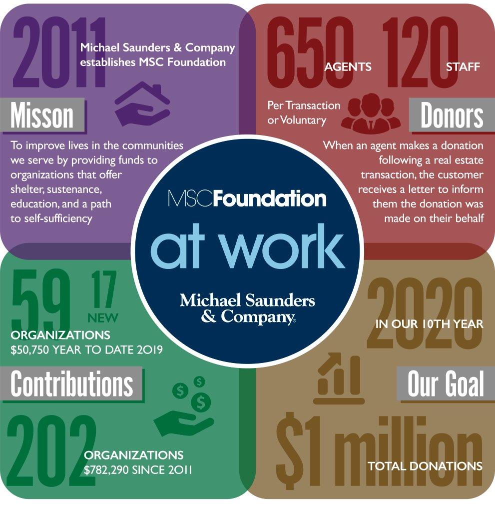 Since launching in 2011, the MSC Foundation has provided $782,290 to 202 organizations across our region – ranging from youth and family services to underserved arts and literacy programs. The goal for the Foundation is to reach $1,000,000 in grant funds by 2020 to celebrate its 10th year. See a complete list of organizations helped by the Foundation here. With contributions from the more than 650 agents and 120 employees, the selected organizations fulfilled the MSC Foundation’s mission to fund community efforts offering shelter, sustenance, education and a path to self-sufficiency. https://youtu.be/Pe6dGhjh92M Over the course of the next several weeks, organizations will receive contributions by each Michael Saunders & Company office for that area. Michael Saunders & Company was featured as one of the “Best Companies That Give Back for 2019” by SRQ Magazine (see pg. 86). Agents and employees that wish to participate have the option of giving by way of their salary, sales commission or through one-time donations throughout each cycle. They can then nominate organizations to the Board of Directors that oversees the day-to-day management of the Foundation and reviews donation requests. The next grant cycle selections will take place November through December of this year. Align your goals of buying or selling real estate with an expert agent equally committed to the community you call home. Contact us at 888.552.5228. [gallery type="slideshow" size="large" ids="29162,29165,29166,29167,29168,29169,29204,29205,29206,29207,29208,29209,29210,29211,29212,29214,29215,29216,29217,29218,29219"] You May Also Enjoy MSC Foundation Distributes Funding to 51 Non-Profit Organizations on Florida's Gulf Coast An Inside Look at our 2019 Annual Company Meeting